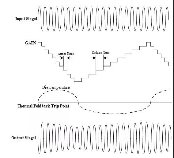 (1)隨著音樂(lè)的播放,當(dāng)PA因環(huán)境溫度增高、音樂(lè)平均功率上升引起溫度累積而板級(jí)散熱不足時(shí),PA結(jié)溫將逐漸升高,當(dāng)結(jié)溫高于自動(dòng)限溫點(diǎn)(Thermal Foldback Trip Point, TFB)時(shí),PA將以啟動(dòng)時(shí)間(Attack Time, tA) 的速率自動(dòng)減小增益,以減小PA功率耗散從而降低結(jié)溫。