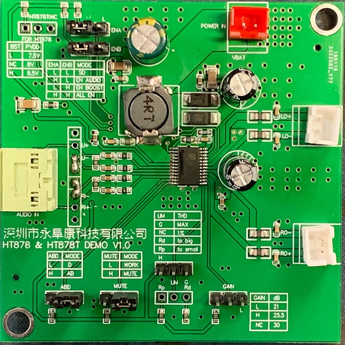 由此,深圳市永阜康科技有限公司推出單節(jié)鋰電池內(nèi)置自適應(yīng)升壓AB/D類切換8W雙聲道音頻功放IC-HT878/HT878T,突破了單節(jié)鋰電池供電的局限性,為用戶提供極致的功率輸出,自帶的AB/D類切換功能完美的解決FM收音干擾,其優(yōu)異的性能堪稱現(xiàn)階段單節(jié)鋰電內(nèi)置升壓雙聲道音頻功放的巔峰之作。