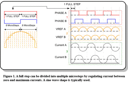 現(xiàn)在,很容易計算出我們馬達的微步進級別。將全步電流強度分成八個更小的電流量級后,馬達繞組受制于八個微步進度。換句話說,我們將1.8度除以8-因此每個微步現(xiàn)在便為0.225度。圖1顯示了通過在零和最大電流設(shè)置之間產(chǎn)生多個電流電平(典型正弦波波形后面),將一個全步分成八個微步的過程。