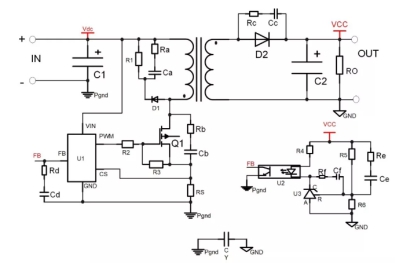 圖1所示的是一個(gè)簡(jiǎn)單的反激式開(kāi)關(guān)電源電路,從圖中可以看出RC電路在圖中的出現(xiàn)過(guò)6次從RaCa—RfCf,每個(gè)RC電路的位置不同,作用也不一樣。本文介紹的是圖1中RbCb,RcCc構(gòu)成的RC吸收電路。這兩個(gè)RC電路在圖中主要作用是: