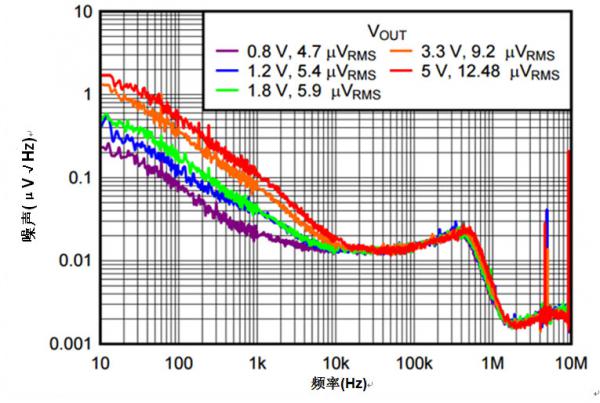 如您從各種曲線(xiàn)看到的那樣,輸出噪聲(以每平方根赫茲[μV/ Hz]來(lái)表示)集中在頻譜低端。該噪聲大部分出自?xún)?nèi)部參考電壓,以及誤差放大器FET和電阻分壓器。