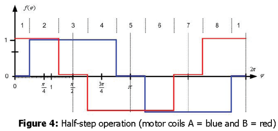 典型的步進電機有50個極(Poles),就是200個整步(Full Steps) ,也就是整步情況下每步1.8°角度,電機旋轉一周需要360°.但是也有些步進電機的步距角更小比如整步需要800步的.起初 這些步進電機被用作整步或者半步模式下,矢量電流提供給電機線圈A(藍色)和線圈B(紅色)矩形曲線圖.描述了整個一個周期360°的曲線.在圖3和圖4中很明顯看到電機線圈在90°換相點處線圈電流要么是最大電流(full power)要么是沒有電流.