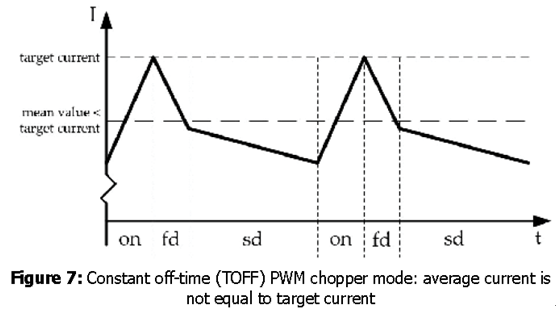 傳統(tǒng)的恒定PWM斬波模式是電流控制的PWM斬波模式,該模式在快速衰減和慢速衰減之間有個固定關系,在其最大數(shù)值的時候,電流才會達到規(guī)定的目標電流,最終導致平均電流是小于預期目標電流的,如圖7所示
