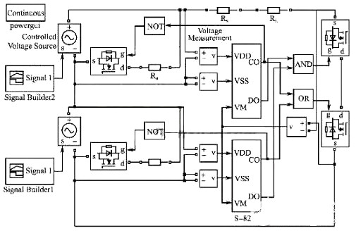 根據(jù)上述均衡充電保護板電路工作的基本原理,在Matlab/Simulink環(huán)境下搭建了系統(tǒng)仿真模型,模擬鋰電池組充放電過程中保護板工作的情況,驗證該設(shè)計方案的可行性。為簡單起見,給出了鋰電池組僅由2節(jié)鋰電池串聯(lián)的仿真模型,如圖5所示。