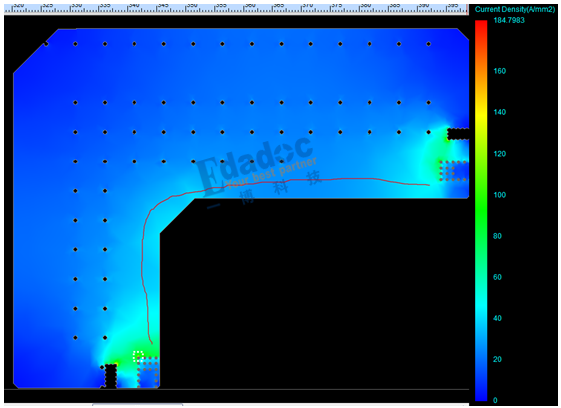 如圖所示,上面是一個(gè)電源平面,標(biāo)識(shí)出來的路線是電流密度最高的部分,綠色部分是電源到回流地平面的最近路徑。從上面可以看出,越近的路徑上,通過的電流越多一些,電流就像我們?nèi)艘粯,也是比較喜歡走捷徑的,都想挑電阻比較小的路徑通過,保存實(shí)力到用電端。這個(gè)特性就會(huì)導(dǎo)致部分區(qū)域的電流密度偏大以及部分過孔通過的電流比較大。所以并不是按照經(jīng)驗(yàn)公式添加相應(yīng)數(shù)量的過孔,電流就會(huì)按照平均分配的方式通過過孔。這就導(dǎo)致一些過孔通過的電流超過能力范圍,可能板子使用一段時(shí)間之后,過孔中間會(huì)斷裂,影響過孔壽命,也影響板子的使用周期。所以對(duì)于一些大電流的電源,過孔加的整整齊齊可能反而會(huì)影響過孔電流的大小,這時(shí)候加過孔是有技巧的,也是靠近電源輸出的過孔電流會(huì)越大,這種情況就建議通過仿真來指導(dǎo)添加過孔陣列。對(duì)于電流密度而言也是一樣,電源輸出端和用電端之間最近的路徑上,電流密度會(huì)比較大,如果最近的路徑上正好是瓶頸區(qū)域的話,需要修改電源路徑。