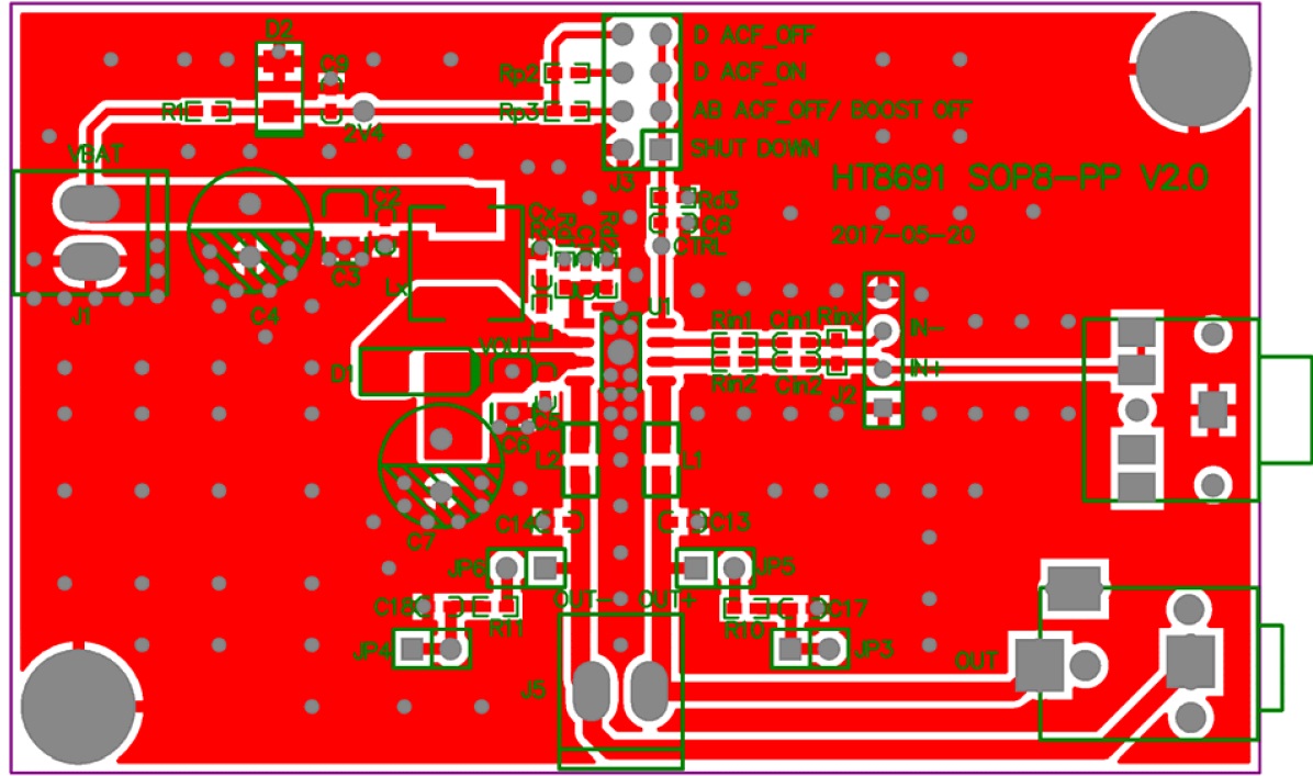 此外,HT8691R內(nèi)置的關(guān)斷功能使待機電流最小化,還集成了輸出端過流保護、片內(nèi)過溫保護和電源欠壓異常保護等功能。