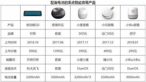 2016年10月,叮咚發(fā)布靈動版A3和悅動版Q3,其中Q3內(nèi)置2200mAH電池,可連續(xù)播放8小時,同時搭配Flash charging快充技術(shù)。2017年,帶電池的便攜音箱逐漸增多,包括若琪的月石、DOSS的小度音箱、出門問問的小問音箱等。進入2018年,蘇寧發(fā)布小Biu智能音箱,搭載DuerOS2.0,配備3000mAh大容量鋰電池,在沒有電源的情況下可連續(xù)工作6小時。