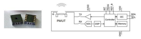 此傳感器方框圖顯示了與壓電式 MEMS 超聲波傳感器(PMUT)相連的CMOS片上系統(tǒng)(SoC)。