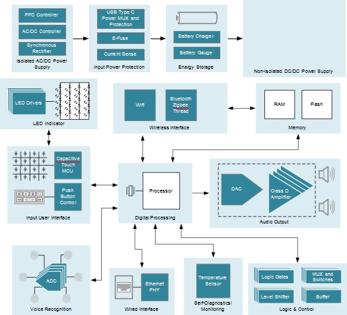但相比于與互聯(lián)網(wǎng)接口結(jié)合使用的麥克風(fēng)和揚(yáng)聲器, 這些外形看似簡單的設(shè)備往往更復(fù)雜。智能音箱包含許多電子功能,這些功能均通過采用數(shù)十種復(fù)雜的集成電路(IC) 來實現(xiàn)。原始設(shè)備制造商 (OEM) 憑借差異化產(chǎn)品進(jìn)入智能揚(yáng)聲器市場,他們必須決定要提供哪些設(shè)備、如何進(jìn)行提供以及此類小型低功耗設(shè)備中可采用的折衷方案。