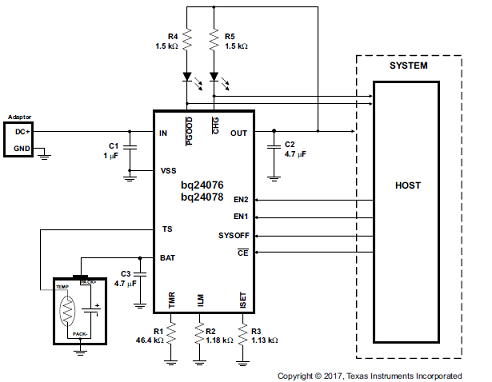 圖2.bq24078/76應(yīng)用電路:主控制充電器