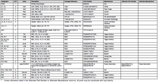評估模塊bq24076/8 EVM材料清單: