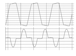 圖1:無(wú)功率因數(shù)校正SMPS的典型線電壓(上圖)和電流波形(下圖)。