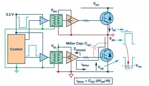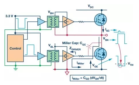 除了系統(tǒng)故障導(dǎo)致的短路,瞬時逆變器直通同樣會發(fā)生在正常工作條件下。此時,IGBT導(dǎo)通要求IGBT驅(qū)動至飽和區(qū)域,在該區(qū)域中導(dǎo)通損耗最低。這通常意味著導(dǎo)通狀態(tài)時的柵極-發(fā)射極電壓大于12 V。IGBT關(guān)斷要求IGBT驅(qū)動至工作截止區(qū)域,以便在高端IGBT導(dǎo)通時成功阻隔兩端的反向高電壓。原則上講,可以通過使IGBT柵極-發(fā)射極電壓下降至0 V實現(xiàn)該目標。但是,必須考慮逆變器臂上低端晶體管導(dǎo)通時的副作用。導(dǎo)通時開關(guān)節(jié)點電壓的快速變化導(dǎo)致容性感應(yīng)電流流過低端IGBT寄生密勒柵極-集電極電容(圖3中的CGC)。該電流流過低端柵極驅(qū)動器(圖3中的ZDRIVER)關(guān)斷阻抗,在低端IGBT柵極發(fā)射極端創(chuàng)造出一個瞬變電壓增加,如圖所示。如果該電壓上升至IGBT閾值電壓VTH以上,則會導(dǎo)致低端IGBT的短暫導(dǎo)通,從而形成瞬態(tài)逆變器臂直通——因為兩個IGBT都短暫導(dǎo)通。這一般不會破壞IGBT,但卻能增加功耗,影響可靠性。