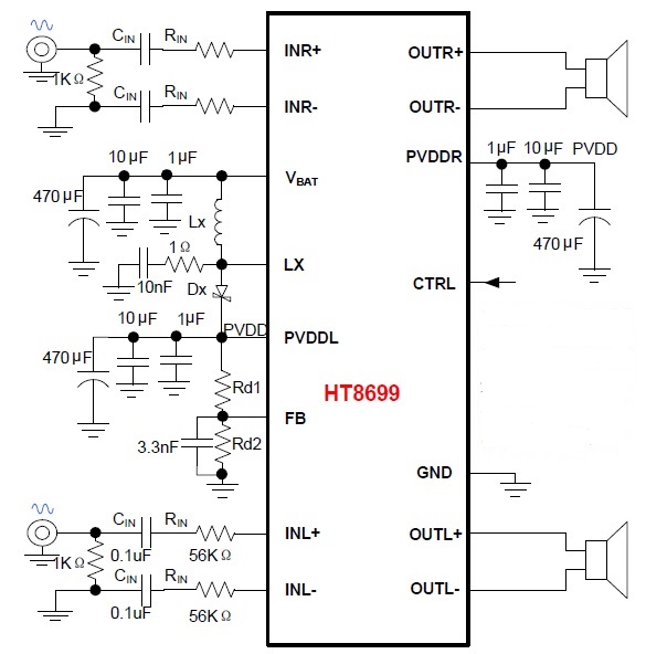 HT8699能通過一個(gè)主控IO口實(shí)現(xiàn)關(guān)斷、開啟、D類/AB類、防破音開啟/關(guān)閉等各種模式的切換,節(jié)省藍(lán)牙主控的資源,外圍簡單。