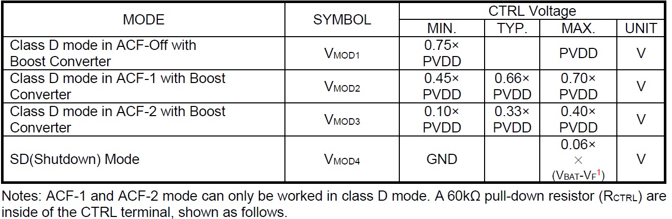 HT8691R 在CTRL端輸入不同電壓值,能實現(xiàn)4種工作模式,詳見下表。