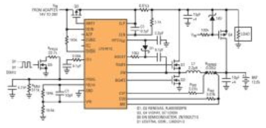 圖1中的解決方案包括LTC4012電池充電器以及由MOSFETS Q1、Q2、電感器L1和輸入輸出濾波電容組成的功率鏈路。在電源故障或掉電的情況下,MOSFET Q3將充電器與輸入線路斷開,MOSFET Q4則將電池連接到負載。通過低功耗MOSFET Q5的柵極提供的控制脈沖信號占空比,調(diào)制流至電池BAT的充電電流。