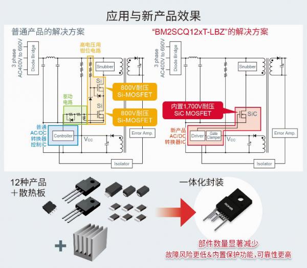 “BM2SCQ12xT-LBZ”是世界首款內(nèi)置節(jié)能性能極其優(yōu)異的SiC MOSFET的AC/DC轉(zhuǎn)換器IC,消除了分立結(jié)構(gòu)帶來的設(shè)計(jì)課題,從而可非常容易地開發(fā)出節(jié)能型AC/DC轉(zhuǎn)換器。專為工業(yè)設(shè)備的輔助電源*3)用而優(yōu)化的控制電路和SiC MOSFET一體化封裝,使得新產(chǎn)品與普通產(chǎn)品相比具有諸多優(yōu)勢(shì),部件數(shù)量顯著減少(將12種產(chǎn)品和散熱板縮減為1個(gè)產(chǎn)品),部件故障風(fēng)險(xiǎn)降低,引進(jìn)SiC MOSFET相應(yīng)的開發(fā)周期減少等,一舉解決了諸多課題。與ROHM以往產(chǎn)品相比,功率轉(zhuǎn)換效率提高達(dá)5%(按功率損耗計(jì)算,削減28%)。因此,本產(chǎn)品非常有助于工業(yè)設(shè)備實(shí)現(xiàn)顯著小型化、高可靠性和節(jié)能化。