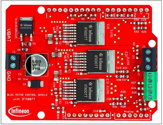 • An Arduino Uno, XMC1100 Boot Kit, or similar board connected to the shield can control the three halfbridgesvia the general IO pins.