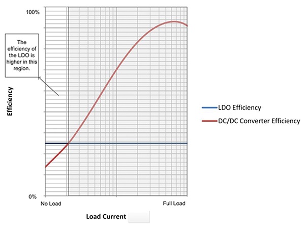 圖2給出了低IQ LDO效率曲線的一般示例,該效率曲線用DC/DC轉(zhuǎn)換器的效率曲線繪制,用于更高的電壓轉(zhuǎn)換(即12 V至1 V)。在輕負(fù)載時,LDO更有效。如果系統(tǒng)在輕負(fù)載下花費(fèi)大量時間,使用LDO來調(diào)節(jié)電壓可以顯著提高系統(tǒng)總效率。