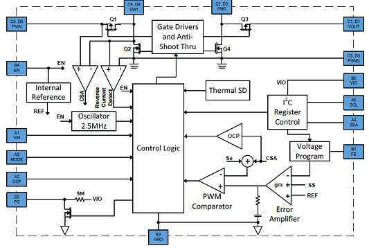 The AP72200 is a high current synchronous buck-boost converter providing high efficiency, excellent transient response and high DC output accuracy. The targeted applications are smartphones, tablets, and other handheld devices. The AP72200 utilizes a four switches H-bridge configuration to support buck and boost operation. The buck-boost provides at least 2A output current.