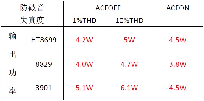 防破音打開,HT8699跟MIX3901功率一樣,都4.5W; ANT8829功率最小3.8W。