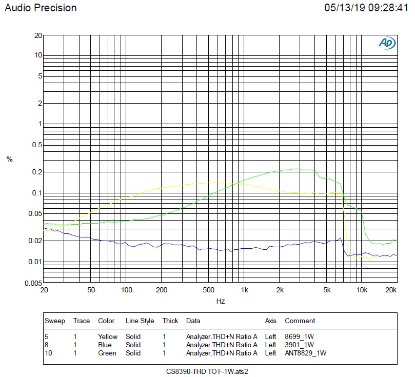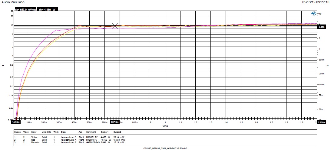 小功率測試,整個(gè)音頻范圍,MIX3901失真度最小,0.01%~0.02%之間;ANT8829在中低頻部分比HT8699好;HT8699在中高頻部分比ANT8829好。