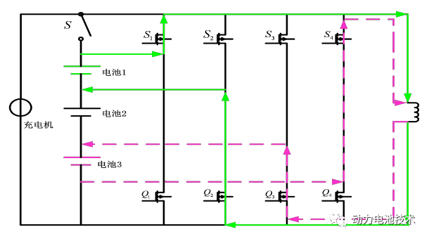 充電過程中,開關(guān)管 S 閉合,充電機給電池組充電。此時電池組右側(cè)開關(guān)管全部斷開,均衡系統(tǒng)不開啟。設(shè)單體電池B1 電壓開始明顯高于其他電池并達到均衡閾值時,此時均衡系統(tǒng)開啟,S1、Q2開關(guān)管閉合,電感與單體電池 B1 并聯(lián),起到分流的作用,電感儲存來自充電機與電池 B1 的能量;當 S1、Q2 開關(guān)管置 0,Q3、S4 開關(guān)管置 1 時,電感給充電過程的單體電池 B3 釋放一定能量。