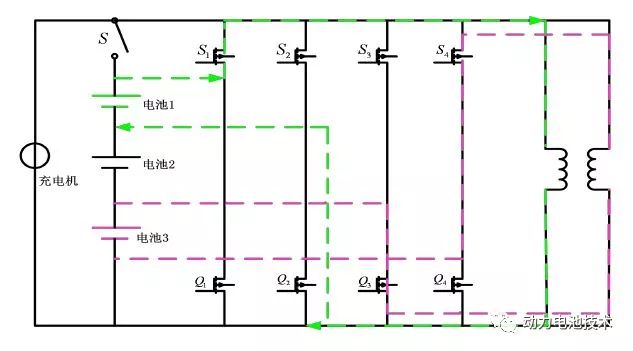控制原理如下:設(shè)電池組內(nèi) B4 電壓最高,B2 電壓最低,控制繼電器 S5、S3、Q4、Q2 閉合,此時兩節(jié)單體電池并聯(lián),兩單體電池自動均衡,電壓趨于一致。該拓撲的缺點是充電過程中不能進行均衡,只能靜置去極化時候進行并聯(lián)均衡。