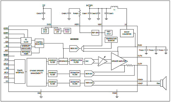 | MAX98390集成動態(tài)揚聲器管理D類放大器解決方案 |