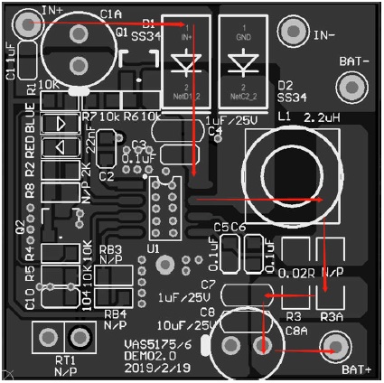 3. 如果充電電流大于1A,為了避免輸入GND走線過(guò)細(xì)的問(wèn)題,C2可以換成插件使用在BS與LX之間,以增加輸入GND的延續(xù)性。