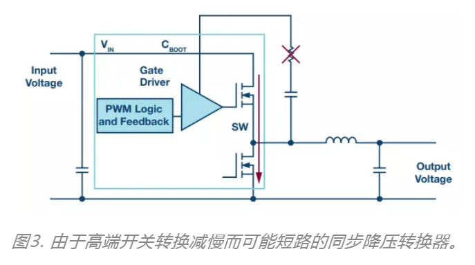 但是,大多數(shù)現(xiàn)代開關(guān)調(diào)節(jié)器都是具有高邊和低邊有源開關(guān)的同步開關(guān)調(diào)節(jié)器。此處,在CBOOT路徑中使用電阻無(wú)法明顯減慢開關(guān)轉(zhuǎn)換。如果此處還是使用與CBOOT串聯(lián)的電阻(如圖3所示),則也將減慢高邊開關(guān)的開關(guān)轉(zhuǎn)換。但是,這可能導(dǎo)致低邊開關(guān)沒有完全關(guān)閉。因此,高邊開關(guān)和低邊開關(guān)可能同時(shí)瞬間打開。這將導(dǎo)致輸入電壓到接地之間出現(xiàn)破壞性短路。這一點(diǎn)尤為關(guān)鍵,因?yàn)殚_關(guān)轉(zhuǎn)換速度也受到工作溫度等參數(shù)和半導(dǎo)體制造中的可變性的影響。因此,即使是在實(shí)驗(yàn)室測(cè)試,也無(wú)法保證安全操作。要減慢具有集成開關(guān)的同步開關(guān)調(diào)節(jié)器的開關(guān)轉(zhuǎn)換,應(yīng)使用可通過(guò)內(nèi)部電路直接設(shè)置開關(guān)轉(zhuǎn)換速度的同步開關(guān)調(diào)節(jié)器,例如ADI的ADP5014。在這些集成電路中,可在內(nèi)部確保:在減慢開關(guān)轉(zhuǎn)換時(shí),兩個(gè)開關(guān)不同時(shí)導(dǎo)通,因此也不會(huì)發(fā)生短路,并且在CBOOT路徑中都沒有電阻。