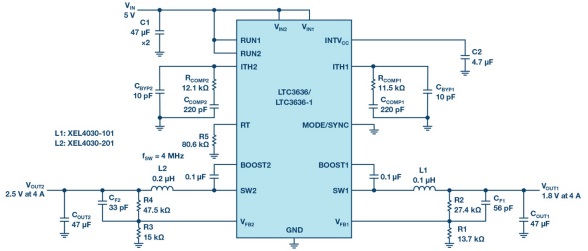 LTC3636是一款雙通道、每路輸出6 A、高效率單芯片降壓穩(wěn)壓器,能夠采用最高20 V的輸入電源電壓?删幊涕_(kāi)關(guān)頻率可以設(shè)置為高達(dá)4 MHz。高開(kāi)關(guān)頻率顯著減小了電感和電容的尺寸和值,但與許多高頻解決方案不同,LTC3636還保持了高效率,可使用一些具有更低交流損耗和直流損耗的超小尺寸鐵氧體電感。兩個(gè)通道錯(cuò)相180°工作,且開(kāi)關(guān)脈沖交錯(cuò)使紋波更低,反過(guò)來(lái)又可以減少輸入電容值。