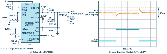 先進(jìn)的SoC和FPGA電子系統(tǒng)在汽車(chē)、交通和工業(yè)應(yīng)用中的激增需要更高性能的電源。這些先進(jìn)SoC的功率需求不斷增加,基于傳統(tǒng)PWM控制器和MOSFET的解決方案必須采用單片穩(wěn)壓器,以便獲得更小的尺寸、更高的電流能力和更高的效率。LTC3636旨在滿(mǎn)足這些先進(jìn)的SoC功率需求,同時(shí)滿(mǎn)足SoC對(duì)方案尺寸和散熱的限制。圖5a顯示兩通道并行的電源的原理圖,在0.85 V的電壓下提供高達(dá)12 A電流。當(dāng)VIN為3.3 V時(shí),12 A輸出負(fù)載的峰值效率為87%。負(fù)載瞬變?nèi)鐖D5b所示。在此設(shè)計(jì)中,F(xiàn)B1和FB2引腳連接在一起,和RUN1和RUN2引腳一樣。ITH1和ITH2引腳連接在一起,并設(shè)置外部補(bǔ)償以最大限度地減少穩(wěn)定狀態(tài)下的電流失配以及瞬變。