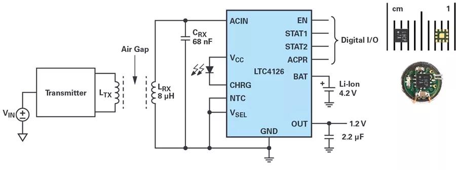 由于LTC4126的高度集成式設(shè)計(jì),只需幾個(gè)外部組件即可創(chuàng)建完整的無(wú)線(xiàn)充電器接收器解決方案。在直徑為6 mm 的應(yīng)用板上,可將整個(gè)設(shè)計(jì)安裝在助聽(tīng)器或耳塞的內(nèi)部。