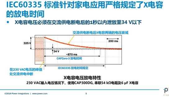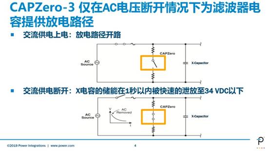 我們常常會(huì)被瞬間斷了電的電源適配器電到,這一現(xiàn)象是因?yàn)槠渲械碾娮璺烹姇r(shí)間不夠快。為防止以上對用戶造成電氣危害,IEC60335標(biāo)準(zhǔn)對家電有著嚴(yán)格的X電容的放電時(shí)間要求,標(biāo)準(zhǔn)規(guī)定X電容電壓必須在交流供電斷電后的1秒以內(nèi)泄放至34V以下。CAPZero-3的推出直接反映到用戶的利益是顯而易見的,其可在870毫秒內(nèi)快速將X電容泄放至34V安全電壓以下。究其技術(shù)背后閻先生給大家普及稱, X電容存在于家電的EMI濾波器部分,跨在零線和火線之間,起到短路電磁干擾噪聲的目的,以達(dá)到相關(guān)電磁干擾規(guī)范要求。但隨著電容容量的增大,電阻越小才能保證放電時(shí)間更快,但同時(shí)這也帶來了功耗的增加,CAPZero-3就用于消除X電容的放電電阻功耗。