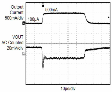 在LDO應(yīng)用中,輸入電壓和輸出負(fù)載有時候會有劇烈的變化。LDO的輸入端可能會因?yàn)楣╇娫O(shè)備的電壓波動而造成LDO的輸入端電壓劇烈變化的情況。輸出端可能會出現(xiàn)輸出負(fù)載的切換,出現(xiàn)某部分負(fù)載啟動或停止等情況。這些情況都會造成LDO輸出電壓產(chǎn)生波動。我們可以通過LDO的瞬態(tài)響應(yīng)曲線來了解LDO在遇到輸入電壓或負(fù)載電流在劇烈變化時LDO輸出電壓的變化情況。具有良好瞬態(tài)響應(yīng)的LDO,在輸入電壓或負(fù)載電流在劇烈變化時,LDO的輸出電壓波動幅度小,恢復(fù)時間快。圖6為某LDO線性瞬態(tài)響應(yīng)曲線,當(dāng)輸入電壓波動1V時,輸出電壓也跟著波動約25mV,然后電壓逐漸恢復(fù)。圖7為某LDO負(fù)載電流突然從0.1mA切換為500mA時,輸出電壓瞬間會跌落約40mV然后有所恢復(fù)。