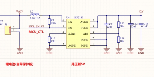 接下來(lái),我們就來(lái)看下升壓部分的電路,鋰電池升壓部分筆者采用了一顆型號(hào)為KF2185的同步升壓芯片,這款芯片的同步升壓效率最高可達(dá)94%,持續(xù)帶載能力可以達(dá)到2A以上,可調(diào)節(jié)電壓輸出,外圍電路也是很簡(jiǎn)單。