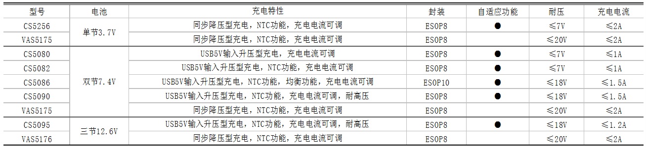 單節(jié)鋰電3.7V、雙節(jié)鋰電7.4V、三節(jié)鋰電12.6V對(duì)應(yīng)的充電管理IC選型表: