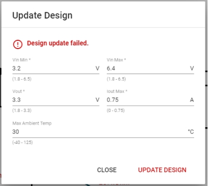 由于最小VIN低于VOUT,設(shè)計更新失敗。此設(shè)計未通過WEBENCH的首檢。