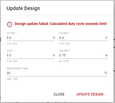 該設(shè)計不會更新,因?yàn)橛嬎銜r的占空比包括高側(cè)MOSFET RDSON和電感器DCR等損耗。此處,占空比值大于99.9%。此設(shè)計未通過WEBENCH的復(fù)檢。