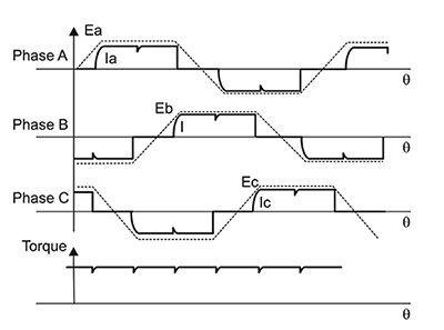 理論上,這樣的系統(tǒng)可產(chǎn)生平滑、恒定扭矩。 實(shí)際上,特定相位的電流不可能瞬間由低轉(zhuǎn)為高。 相反,所導(dǎo)致的上升時(shí)間在輸出中生成與轉(zhuǎn)向定時(shí)一致的波紋(圖 2)。