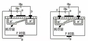 耗盡型MOS場效應(yīng)管,是在制造過程中,預(yù)先在SiO2絕緣層中摻入大量的正離子,因此,在UGS=0時,這些正離子產(chǎn)生的電場也能在P型襯底中“感應(yīng)”出足夠的電子,形成N型導(dǎo)電溝道。
