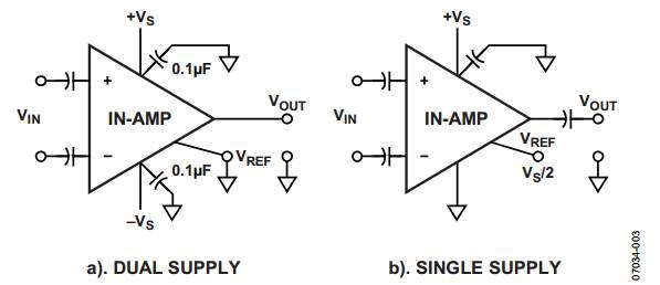 圖3所示的是通過(guò)兩個(gè)電容進(jìn)行交流耦合的儀表放大器電路,也沒(méi)有為輸入偏置電流提供回路。該問(wèn)題常見(jiàn)于采用雙電源供電(圖3a)和單電源供電(圖3b)的儀表放大器電路中。