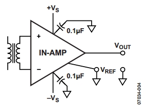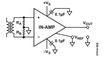 圖5 儀表放大器變壓器輸入耦合的正確方法