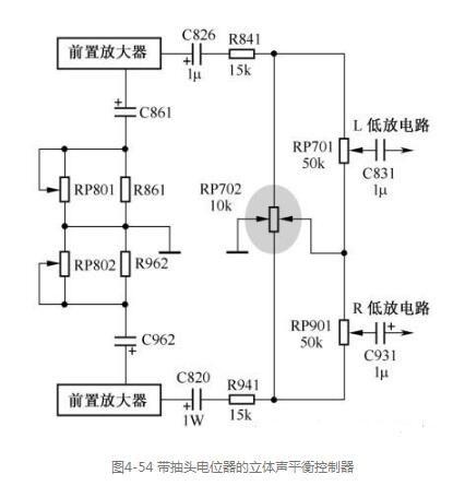 圖4-54所示是帶抽頭電位器的立體聲平衡控制器,RP702是平衡控制電位器,它的中心阻值處有一個抽頭,且抽頭接地。