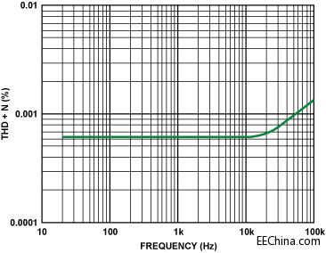 圖2顯示整個音頻范圍內的總諧波失真及噪聲。誤差隨頻率提高而變大,但20 kHz時總誤差仍然小于0.0007%。圖3給出了該IC的連接圖。