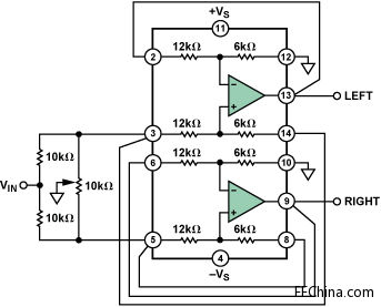 本電路中,信號通過10 kΩ串聯電阻在兩個放大器之間分配。兩個同相輸入端之間插入一個游標接地的電位計。電位計和10 kΩ電阻的組合構成一個輕負載,很容易被大多數信號源驅動。放大器的增益配置為3。當電位計游標位于任一端時,一個輸入端接地,因此不會有信號傳送至對應的輸出端。另一輸入端的