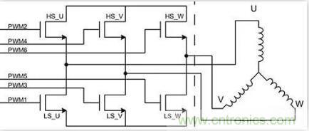 電機(jī)控制系統(tǒng)一個(gè)完整的電機(jī)控制系統(tǒng)包括電源、主機(jī)微控制器、柵極驅(qū)動(dòng)器以及采用半橋拓?fù)浣Y(jié)構(gòu)的 MOSFET(圖 2)。微控制器用于設(shè)置 PWM 占空比并負(fù)責(zé)開環(huán)控制。在低壓設(shè)計(jì)中,柵極驅(qū)動(dòng)器和 MOSFET 橋有時(shí)會(huì)集成在一個(gè)單元中。然而,對(duì)于高功率單元,為方便熱管理,柵極驅(qū)動(dòng)器和 MOSFET 橋會(huì)分開布置,這樣可以針對(duì)柵極驅(qū)動(dòng)器和橋采用不同的工藝技術(shù)并最大限度地降低 EMI。
