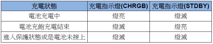 IC 進(jìn)入正常充電時(shí)CHRGB 燈號(hào)會(huì)恆亮,充電截止時(shí)CHRGB 燈號(hào)會(huì)熄滅,當(dāng)電池充飽後又放電至Recharge 電壓4V (約95%的截止電壓),而此時(shí)輸入電源還在的話,CHRGB 燈號(hào)會(huì)再度亮起來(lái),IC 會(huì)開(kāi)始充電直到充電截止,STDBY 燈則相反。