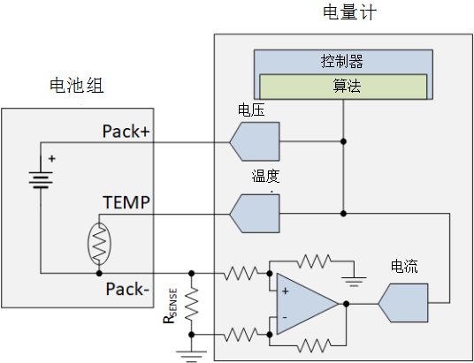 圖1:帶外部電流檢測(cè)放大器和控制器測(cè)量的電量計(jì)